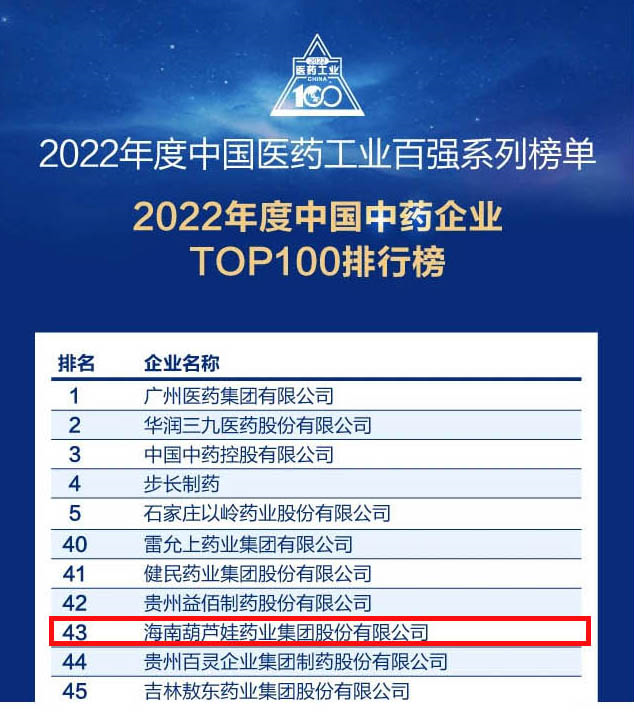 CA88药业集团连续4年荣登“中国中药企业TOP100排行榜”,排名上升至第43位